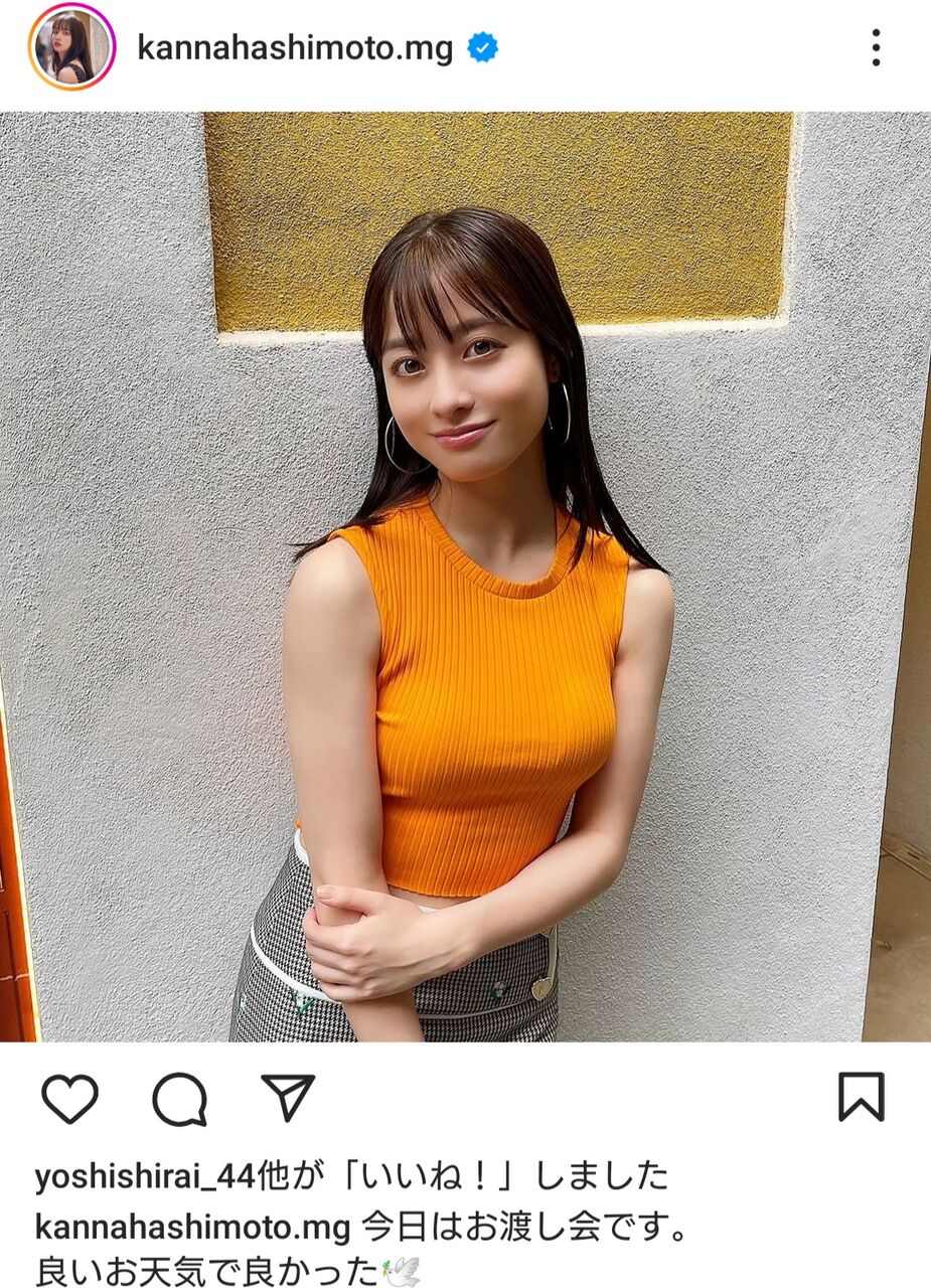 にっこりと〝爽やか〟スマイルに鮮やかなオレンジ色のタンクトップ姿を披露。お渡し会は先着応募での写真集購入者を対象に行われている。また、橋本のSNSでは写真集の販売を記念して〝秘蔵の〟オフショットを公開している。