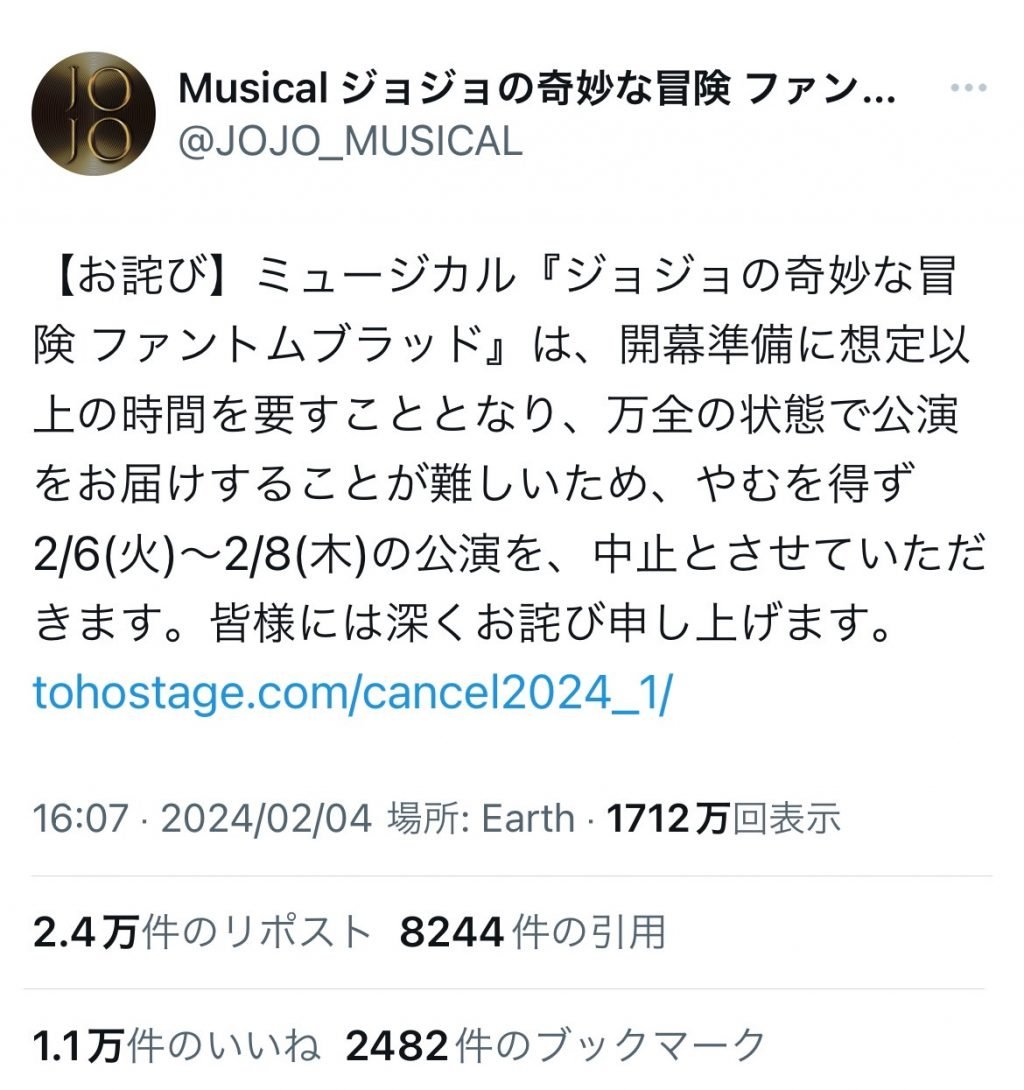 急きょ初日2日前に開幕延期が発表され、さらに3公演の中止延長が発表された。休止回についてはチケット代金や交通費、宿泊費などを負担するという。本公演を無料視聴できるようにも検討しているという。