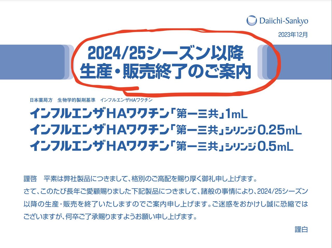 従来型のインフルエンザワクチンは生産終了してmRNAワクチンに切り替えられるからな