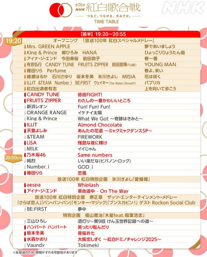 「第76回NHK紅白歌合戦」タイムテーブル発表