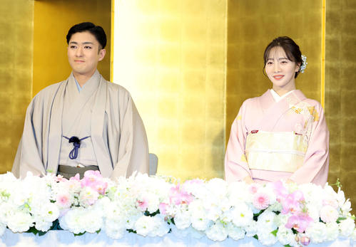 歌舞伎俳優中村橋之助(29)と元乃木坂46の能條愛未(31)が10日、婚約を発表し、都内ホテルでそろって会見を行った。能條は、橋之助の母三田寛子が、91年に中村芝翫(当時3代目橋之助)との婚約発表会見で着用した着物を着て登壇した。26年初夏に挙式、披露宴を執り行うという。