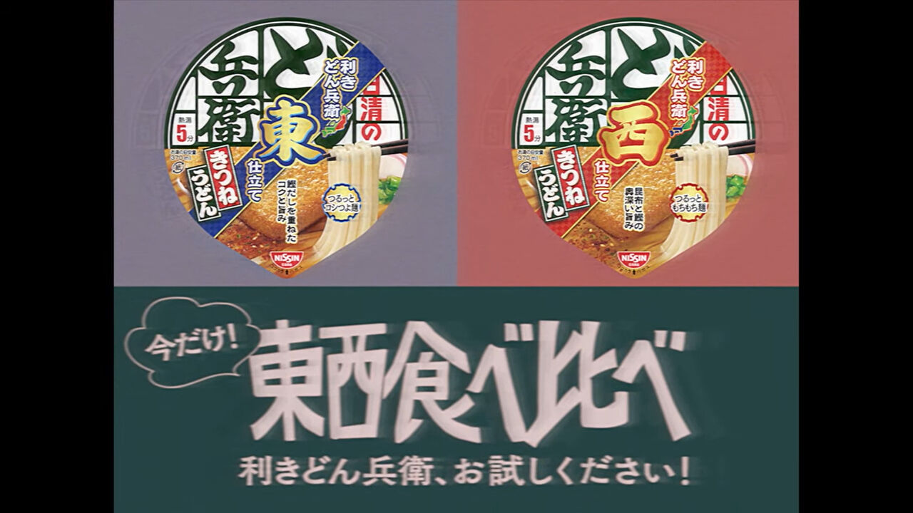内容は、西日本と東日本で麺やつゆが異なるどん兵衛を、全国どこでも購入して食べ比べできる「利きどん兵衛」シリーズを紹介するもの。
